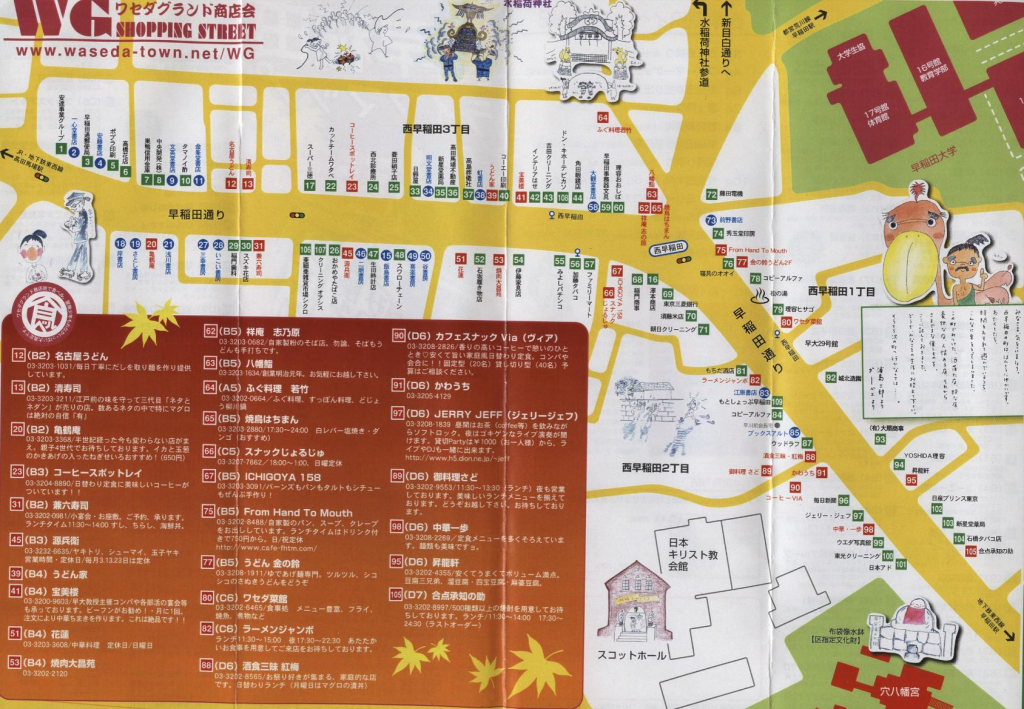 In 1951, "Waseda Grand Assosiaation of Commerce" was renamed to "Waseda Grand Shopping Association" for 35 years and reached the present. It is located in the Bunkyo district facing Waseda Street, They are composed of the "Seven shopping association around 7 shopping district and old book shop streets".