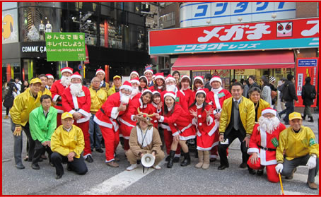 本イベントは新宿駅東口で、早稲田大学のデキシーランドジャズクラブの皆様と商店街関係者、ご来客の皆様と共に街の周りをパレードで周りサンタの格好をしたスタッフがお菓子を配りながら、街をきれいに清掃をするといった、クリスマスらしいイベントです。