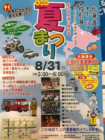 牛込中央通り夏祭りは、毎年8月の最終日曜日に商店会のスタッフが力を取り組んでいるイベントです。物産展や大抽選会などお客様からも大好評。ポスターにございます一昨年のイベントは北海道地区をテーマに開催させていただきました。