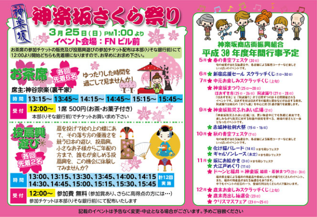 | イベント名 | さくら祭り [ URL: https://www.kagurazaka-6.com/%E3%81%95%E3%81%8F%E3%82%89%E7%A5%AD%E3%82%8A/] |