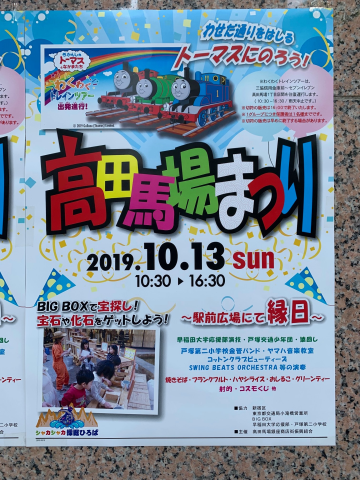 駅前広場にて縁日・音楽演奏・早稲田大学応援部演技、ビッグボックスコンコースにて恐竜ロボット展示、早稲田通りにて機関車トーマスを走らせます。