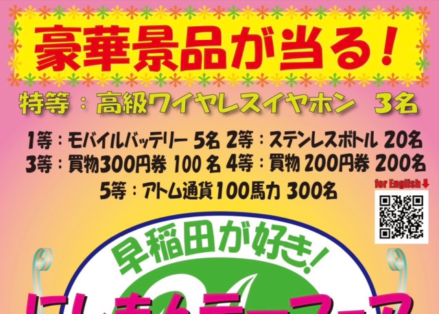 During the event, you can get a raffle ticket by spending more than 500 yen on Nishimon Street. You need to have two tickets to participate in the raffle draw on April 24.