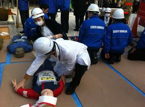 毎年11月、新宿区信濃町地域の地域団体・企業・四谷消防署・が協力して、災害時を想定しての消防訓練が行われます。本年は聖教新聞社の前庭とビルで行われました。四谷消防署による消火訓練や、ビルの最上階からのはしご車やロープでの救出、慶応病院の多数のスタッフによるけが人の応急手当、見学者も参加しての避難訓練など、臨場感の迫る訓練で、防災減災の対策や日頃からの地域連携の重要性を実感できる催しとなりました。この訓練は毎年行われ新宿区からも高い評価を受けています。本年は11月14日(土)9:50から行われます。