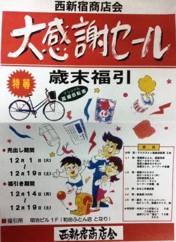 毎年12月には歳末福引大感謝セールを開催しております。売り出し期間は1日からの3週間で、期間中西新宿商店会の参加店でお買い物いただいた方に500円で補助券1枚、2000円で本券1枚配布しております。補助券4枚または本券1枚で1回抽選ができます。景品は豪華多数取り揃えており空くじななのでみなさんにご好評いただいております。5等でも箱ティッシュやお菓子なのでお得です。歳末にはぜひ西新宿商店会までお買いものに足をお運び下さい。皆様のご来店を心よりお待ちしております。