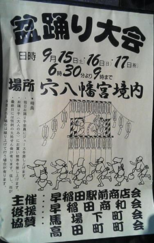 早稲田駅前商店会では、毎年9月に穴八幡境内で盆踊り大会を開催しております。今年は9月9日(金)、10日(土)の日程で、10日には豪華景品が当たる大抽選会を実施の加え、お子様にはお菓子の無料配布、踊る方にももれなく無料で飲み物を配布しております。本商店会でも力を入れ取り組んでいる出し物でで毎年たくさんの方が訪れる楽しい大イベントですので、皆様お誘い合わせのうえぜひご来場下さい。