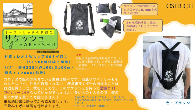 お酒好きにはたまらない、アクセサリーが入荷しました。 その名もサケッシュ!! 外食が自粛される中、ご自宅で飲んでる方も多いはず。 自転車を交通の手段として使用されている方は一升瓶なんか帰宅途中に、購入した時はお困りのはず、そんな時はこのサケッシュの出番です。 なんと一升瓶がはいるんです!! お酒以外にもペットボトルやネギ、大根などにもおすすめです。