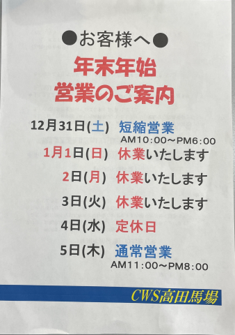 年末は、12月31日まで営業いたしますが 18時までの短縮営業とさせていただきます