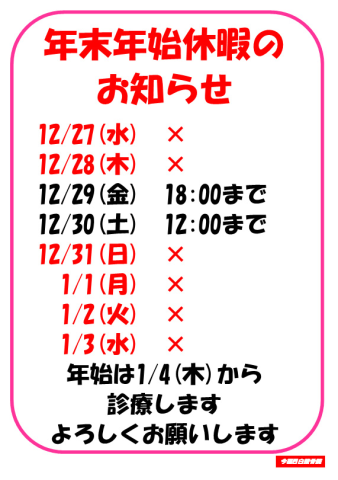 12/27(水)休、12/28(木)休、12/29(金)18:00まで、12/30(土)12:00まで、12/31(日)休、1/1(月)休、1/2(火)休、1/3(水)休、年始は1/4(木)から診療します。