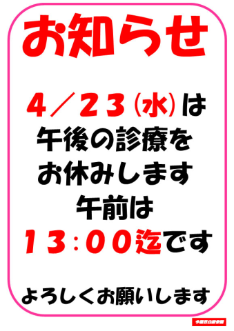 8/9(土)休診、8/13(水)午後休診のお知らせ