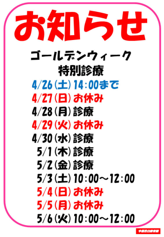 5/3(土)、5/6(火)は10:00~12:00で特別診療します。