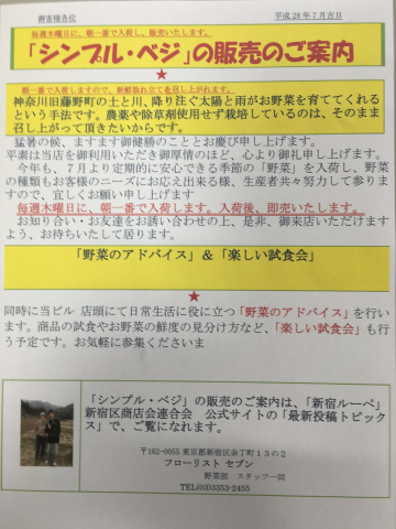 猛暑の季節、毎日暑さが厳しい季節、当店では、毎日「お薦め商品」と称して、お得な切り花・鉢物をお手頃価格でご提供しております。 外は暑くても皆様のお部屋は、当店のお花で快適にお過ごし下さい。 「シンプルベジ」は、毎週木曜日に販売を予定しております。 本日、ただ今入荷、販売致しております。 農薬や除草剤を使わずの栽培ですので、皆さんに好評にて召し上がって頂いて居ります。 当店の地下一階の「レンタルルーム」も低料金でご提供させて頂いて居りますので、是非一度ご利用下さる様、お待ち申して居ります。
