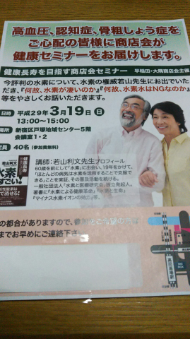 物を売ったり買ったりサービスを提供するだけが商店会 の仕事ではないし、望まれている事でもありません。 地域の安全と安心を担保するのも商店会の大事な仕事です。 その具体的な活動として本日(3/19)、高田馬場の戸塚地域センターを会場にして「健康長寿を目指す商店会セミナー」を開催しました。 ※早稲田商店会・大隈通り商店会主催です。 【チラシの写真】 トップに「高血圧、認知症、骨粗しょう症をご心配の皆様に 商店会が健康セミナーをお届けします。」と書きました。 【商店会健康セミナーの写真】 講師は水素の権威、若山利文先生です。 26名の皆さんに熱心に聞いていただきました。 |