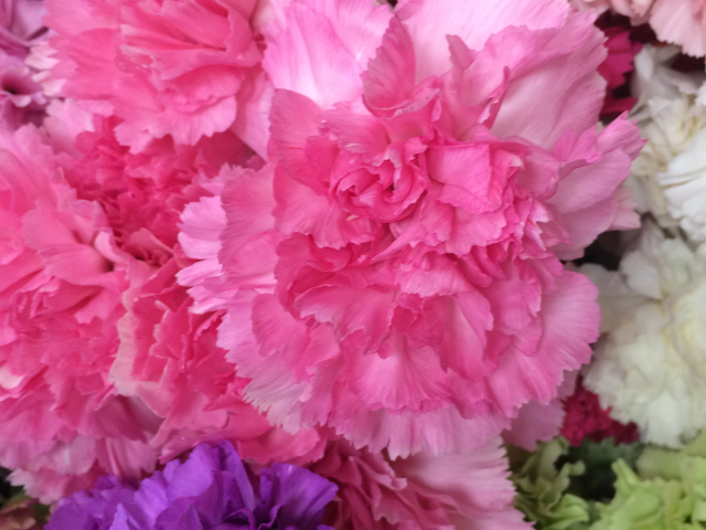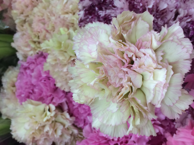 母の日に向けて一年で一番カーネーションの品種が出回る時期です。 写真のような蛍光ピンク、 クリーム色に少しピンクの筋のはいったもの サフィニアの紫を遺伝子組み換えでいれた紫色のカーネーション 「ムーンダスト」現在は紫系で4色発売されています。 この時期にぜひ、お気に入りの色を見つけてみてくださいね。