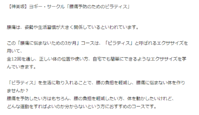 今現在腰痛に悩まれている方も、腰痛を予防したい方、腰の負担を軽減したい方も、軽い運動が可能であればどなたでも大歓迎! 特に神楽坂はお店を営まれている方が多いので、立ち仕事や重い荷物を運んでいて、「腰痛」が気になる方も多いのではないでしょうか? 毎回同じインストラクター、同じメンバーで気兼ねなくクラスを行っていく「ヨギー・サークル」というその名の通りサークル感覚でクラスを楽しんでいただけるものになります。 全12回を通し、正しい体の位置や使い方、自宅でも簡単にできるようなエクササイズを学んでいきます。 担当のエリ先生は、ピラティスインストラクターではありますが、もともとは理学療法士なので、どうして腰痛になるのか、腰痛を予防するためには…といった説明もしてくださいます。 神楽坂のお店が始まる前のお時間なので、商店街の方々も通いやすいのでは…と思ってみたり(゚∀゚)笑 気になる方がいらっしゃいましたら、ぜひお尋ねくださいませ! 詳しくはコチラ↓ http://www.studio-yoggy.com/classes/circle/20150104_09.html 03-5225-3525 |