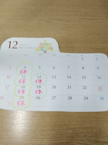 12月の定休日です。