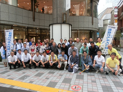 新宿区より、環境清掃部長を始め4人のご参加をいただき、さらに艶やかな浴衣姿の女性を含め、商店街の有志総勢50名で商店街内に打ち水をしました。