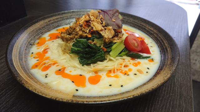 から炒りした香味野菜とスパイシーな挽肉とゴマの風味の豆乳仕立てのスープのハーモニー。