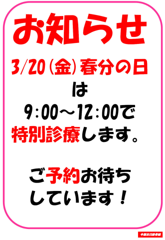 3/20(金)春分の日は9:00~12:00で特別診療します。ご予約お待ちしています。