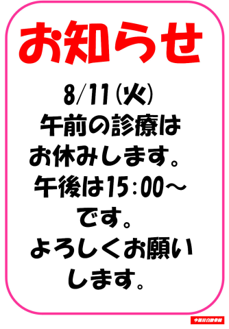 8/11(火)午前の診療はお休みします。