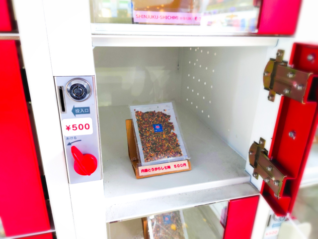 当店の店頭のロッカー型自動販売機では、内藤とうがらし七味とひんぎゃの塩の販売を24時間しております!